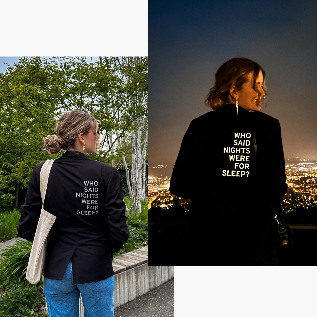 In ufficio o per i momenti più informali: nessun problema con il nostro versatile look blazer! Inizia la giornata in modo casual con una semplice t-shirt e jeans comodi, impreziositi dal blazer upcycled di OBLIVOUS nell’ intramontabile color nero. Perfetto per il lavoro, conferisce al look un immediato tocco di eleganza. Ma la giornata non è ancora finita! Togli jeans e maglietta e indossa un vestito elegante. Abbinalo al blazer, per un’eleganza dal tocco raffinato. Con la scritta riflettente sulla schiena è un vero e proprio statement piece. Con questo look blazer, puoi passare facilmente dal giorno alla notte, fedele al motto «Who said nights were for sleep?»