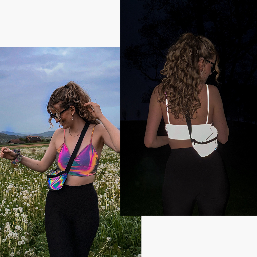 Un outfit elegante e unico è un must per il tuo festival preferito. Il top di NewL abbinato alla borsa con cintura Rainbow di Reflective Berlin è un vero e proprio eye-catcher. La borsa con cintura ti permette di riporre in modo sicuro i tuoi oggetti essenziali mentre ti godi il ritmo.