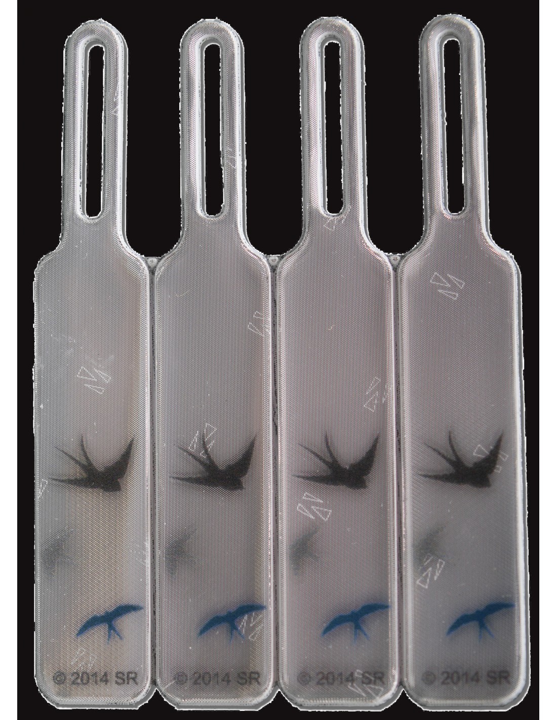 Set di 4 ciondoli riflettenti per cerniera *rondini*. Ca. 85 × 15 mm.