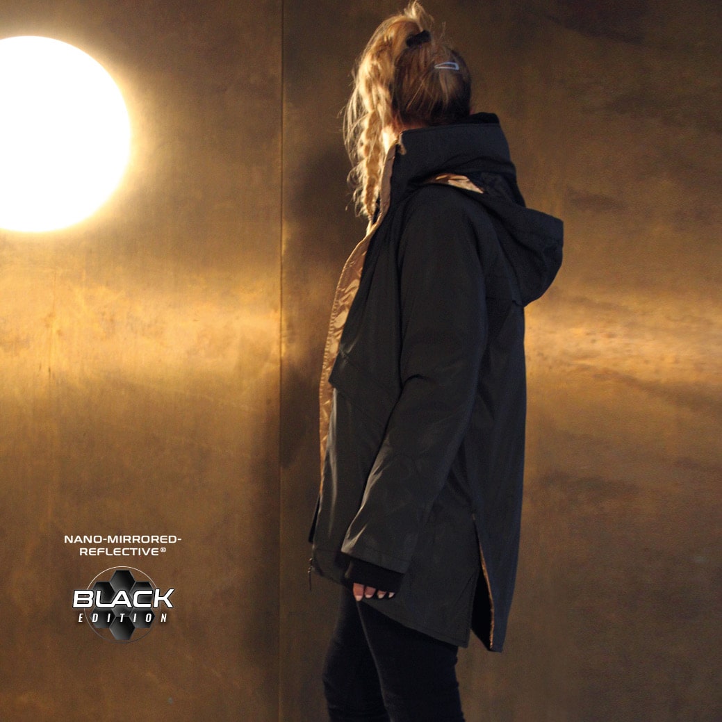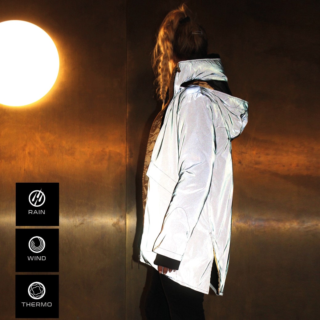 Diese regenabweisende und windfeste Regenjacke im Parka Style, ​ist perfekt geeignet für den Stadtverkehr oder Spaziergängen am Abend. Durch das NANO-MIRRORED-REFLECTIVE© Material aus Polyester werden schon kleinste Lichtquellen reflektiert. Du flashst damit alle, egal ob dich eine Velolampe, eine Strassenlaterne oder ein Autoscheinwerfer anleuchtet.